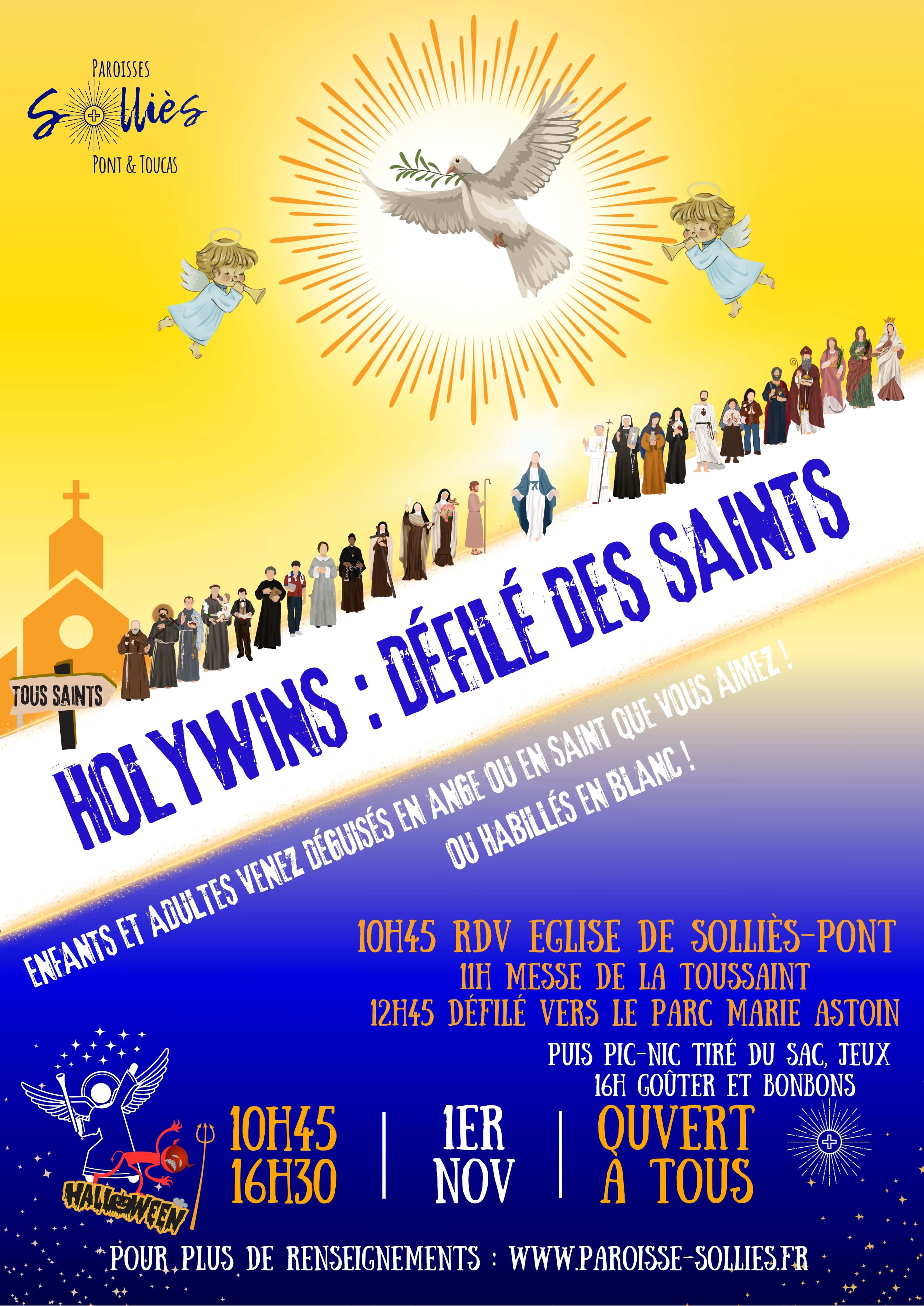 A l’occasion de la fête de la Toussaint (fête de tous les saints connus et inconnus, vivants au Ciel), et à contrepied d’Halloween, la paroisse de Solliès propose encore cette année un défilé des saints. Nous invitons donc tous les enfants (même les tout petits) et les jeunes et adultes à venir déguisés en saint de leur choix (ou ange) ou à venir habillé en blanc lors de la messe du 1er novembre à 11h. Pour éviter que tout le monde se déguise en même saint, vous pouvez vous inscrire sur ce lien : Saints pour le défilé des saints – Google Sheets
